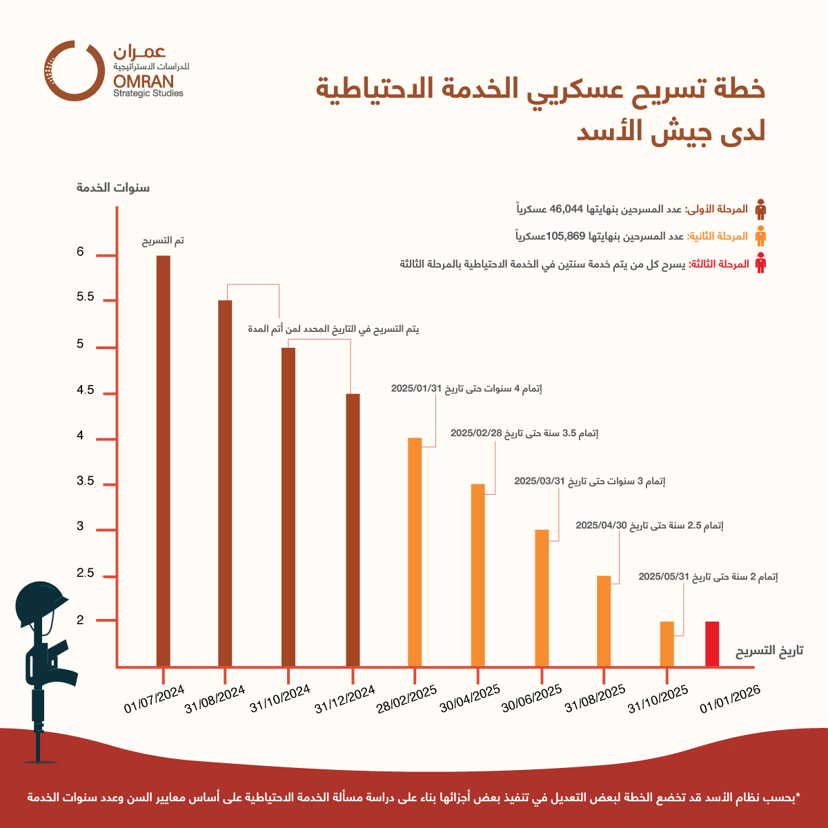 يُشير العدد الكبير من العسكريين والذي يبلغ نحو 152 ألف عسكري في الخدمة الاحتياطية المتوقع تسريحهم بحلول نهاية عام 2025([6])، إلى توفر موارد بشرية كبيرة لدى جيش النظام، وهذا الرقم لا يشمل أعداد المتطوعين أو العسكريين في الخدمة الإلزامية حين صدور الخطة، مما يتعارض تماماً مع التقديرات والتقارير السابقة التي تحدثت عن وجود نقص بشري كبير لدى جيش النظام([7]).